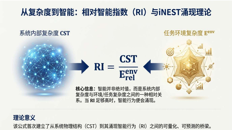 特邀报告人刘勤让教授以“iNEST提出背景与理论——六个自然常数与智能等级关系”为主题带来深度学术分享,提出“结构第一性”核心观点,强调人脑的智能本质存在于复杂网络的结构之中,智能并非单纯的算力堆砌,而是网络时空协同复杂度(CST)跨越临界阈值后的涌现产物。报告详细阐释了CST复杂度与相对智能指数(RI)的量化关系,通过数学物理方程构建边界条件,以六个自然常数定义的智能涌现阶梯为智能研究提供了统一度量衡。而介观尺度作为介于微观器件与宏观系统之间的关键区间,能完美满足智能涌现对结构复杂性与动态协同性的双重需求。