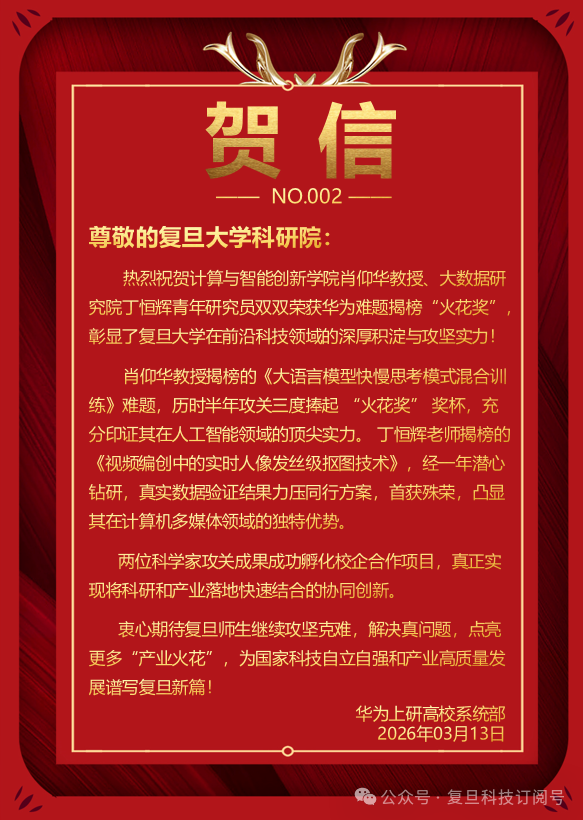 华为贺信:祝贺大数据研究院丁恒辉青年研究员荣获“火花奖”!