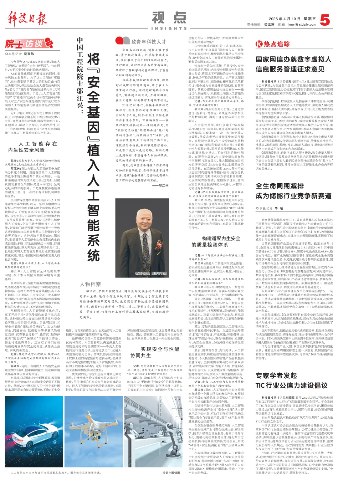 邬江兴:我认为,加快构建人工智能内生安全质量检测体系,需要从科学问题破解、平台建设、行业试点三个方面协同发力。
